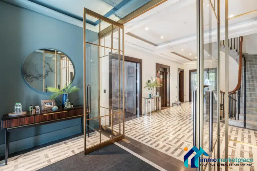 Wooden parquet flooring seamlessly complements the natural stone entrance hall, setting the stage for an impressive Halstock kitchen, featuring integrated appliances from Sub-Zero and Wolf.