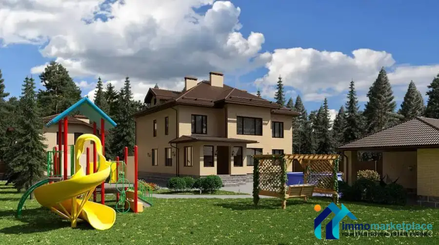 A new cottage for sale + a garage, a guest apartment and a spa complex, on a land plot of 17 hundred, a plot with its own access to the territory of a forest park with paths for walking and skiing, with routes for ATVs. The total area of buildings is 575 sq.m., including: Cottage - 350 sq.m., Garage for 2 cars + 2 cars under a canopy and Guest apartment - 125 sq.m .. @ SPA / Bath complex - 100 sq. .m. Readiness - House for final finishing, all communications are central, brought into the house, heating - gas boiler. Guest apartment - residential, turnkey, kitchen furniture installed. Garage - finished "turnkey", automatic gates are installed.