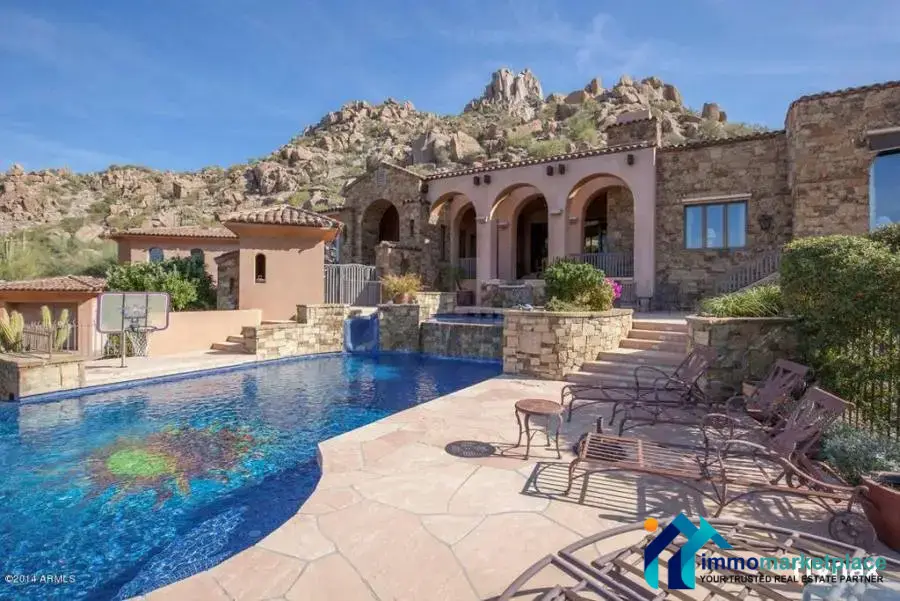 An extraordinary property nestled just under Pinnacle Peak on the highest lot in Estancia * A exceptional example of tradition, charm & elegance designed by Jeff Biever and built by Bob Byrd * Split floor plan with a large master suite that includes a sitting area and office * Beautifully landscaped hillside setting with a negative edge pool that spills toward spectacular city light, mountain and golf course views * Interior details and materials include travertine and flagstone flooring, granite and marble surfaces and hand-carved doors and cabinetry * A separate entrance guest house with kitchenette completes the residence *\r