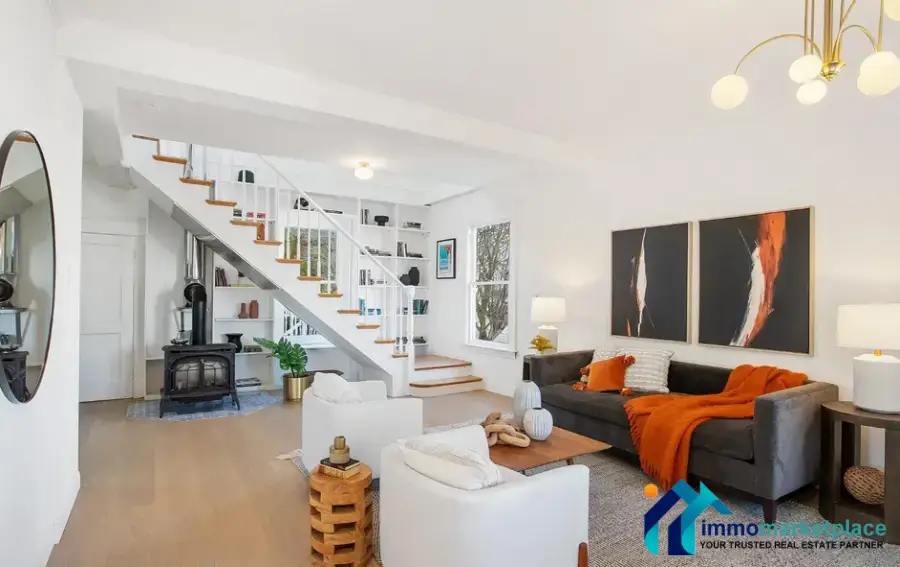 This charming single family home is detached, has high ceilings, exceptional light and offers a terrific floor plan on two floors. Anyone who is curious to know the history of the home that sits sideways on Day St. should stop by. Upon entering the eye is drawn to the floating staircase and bookshelves that cover the back wall and anchor the first floor. The warm Oak floors provide a seamless integration of the living, dining and kitchen. A large bedroom, full bath and the laundry facilities complete the first floor. Upstairs there is a spacious family room, 2nd bedroom, office nook, and full bath. A South facing deck off of the family room is perfect for retreating with a book, or cup of coffee. A full basement provides for ample storage and other workshop needs. Do not miss the opportunity to own in Noe Valley. It is cute as a button and the perfect condo alternative.