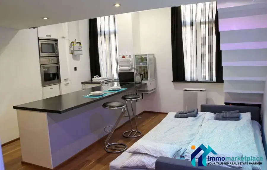 32 nm-es, valóságban 61 nm -es, kétszintes, (galéria) cirkó fűtéses társasházi lakás. Az ingatlan a bulis éjszakai élethez közel van de mégis a belső udvari volta miatt nagyon csendes. A ház engedi az Airbnb-t. A földszinti stúdiólakás klímával,mosogatógéppel, hangulatvilágítással, hangtechnikával, internettel,két tévével rendelkezik. Jelenleg hosszútávra van kiadva albérlőknek. A 15-19.000 Ft között változó közös költség magába foglalja a szemétszállítás és a hideg víz díját.