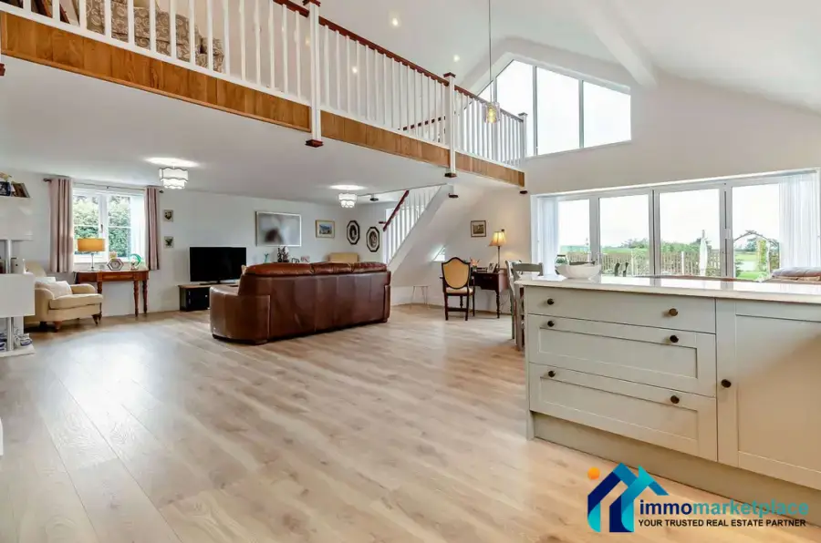 The home opens into a spacious entrance hall, setting the tone for the light-filled interiors beyond. The hub of the home is a striking open plan reception room and kitchen, complete with vaulted ceiling, doors opening onto the patio, and a staircase leading to a mezzanine level that overlooks the living space ideal as a reading nook or office. The kitchen connects seamlessly to a practical utility room.